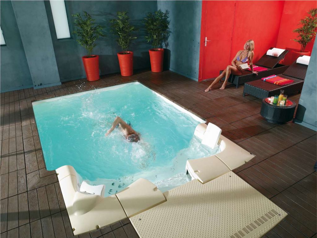 El sistema de piscina o natación contracorriente se adapta a todos los sistemas de filtración de la gama (salvo el GRI 110). Un aumento de más del 50% en el caudal de agua (que sale por la boquilla de impulsión) acoplado al aire permite masajear el cuerpo y relajar la espalda con más eficacia. El sistema de natación contracorriente, que se utiliza con la manga de masaje, también tiene una función drenante.